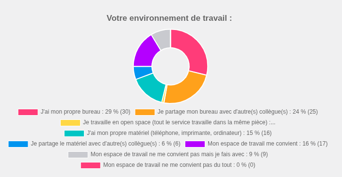 • Bureaux individuels ou partagés : Si certains agents bénéficient de leur propre bureau, une part importante d’entre vous partage son bureau avec d’autres collègues. Quelques un.es mentionnent également travailler en open space.
