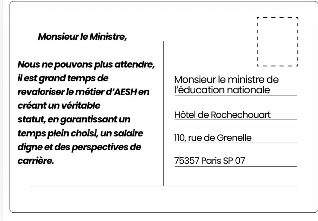 Chaque carte envoyée constitue un message collectif fort : celui d’une profession mobilisée qui exige des avancées concrètes pour améliorer la situation des AESH.