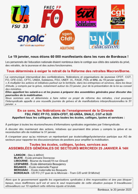 Suite à la forte mobilisation de jeudi 19 janvier, l’intersyndicale s’est réunie par exemple à Bordeaux dès vendredi 20 janvier. Voici notre tract commun et l’appel dès maintenant à mobilisation pour amplifier le mouvement et la grève du 31 janvier.