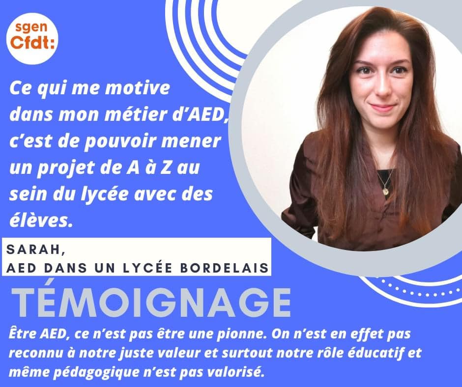 Premier témoignage autour du métier d’assistante d’éducation, un métier mal reconnu, mal considéré que le Sgen-CFDT entend mettre en lumière tant il est une pierre angulaire au sein des établissements du second degré. Aujourd’hui, Sarah AED dans un lycée bordelais.