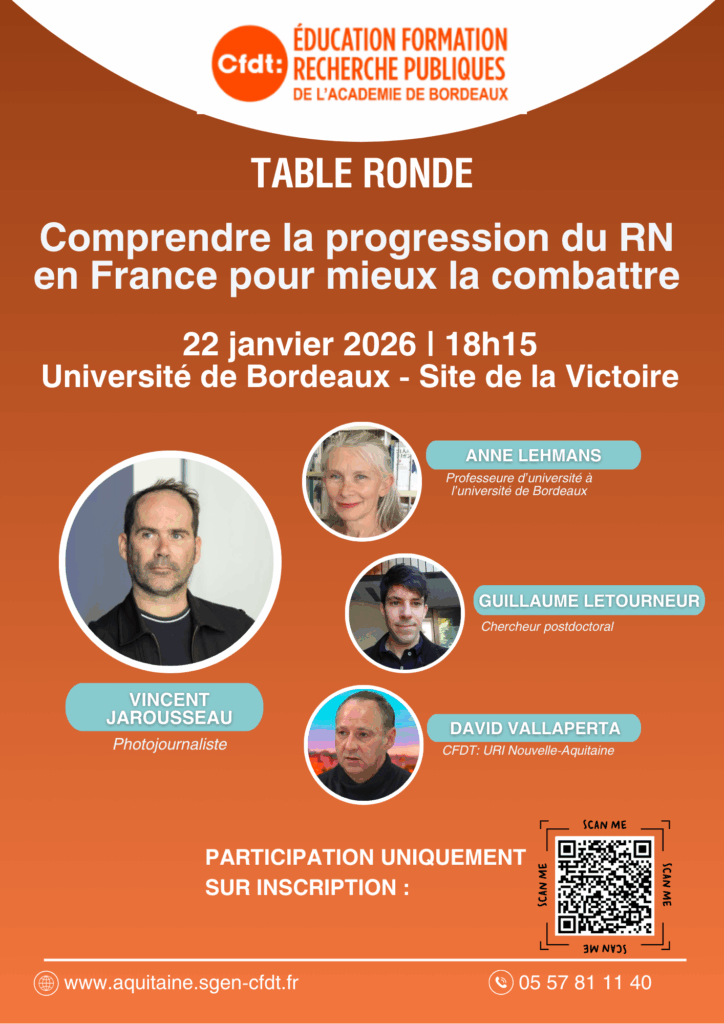 La CFDT de l’académie de Bordeaux organise une table ronde exceptionnelle le jeudi 22 janvier 2026, en présence de Vincent Jarousseau, photojournaliste, à l’occasion de la parution de son ouvrage « Des âmes et des urnes ».